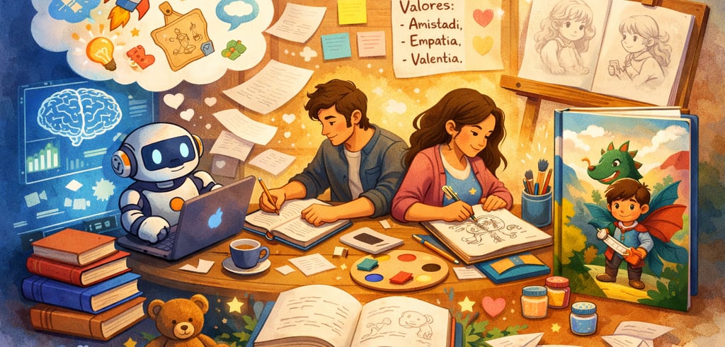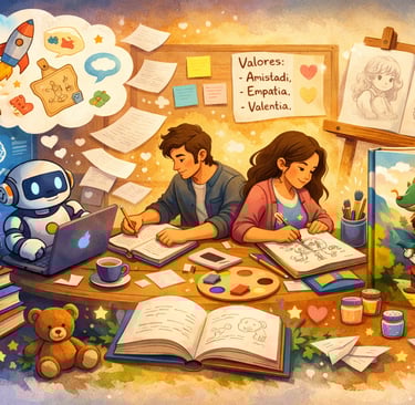 Descubre cómo usamos la inteligencia artificial en la creación de cuentos infantiles: como apoyo creativo e inspiración, siempre con revisión pedagógica, valores bien trabajados y un proceso artesanal y humano en cada historia.